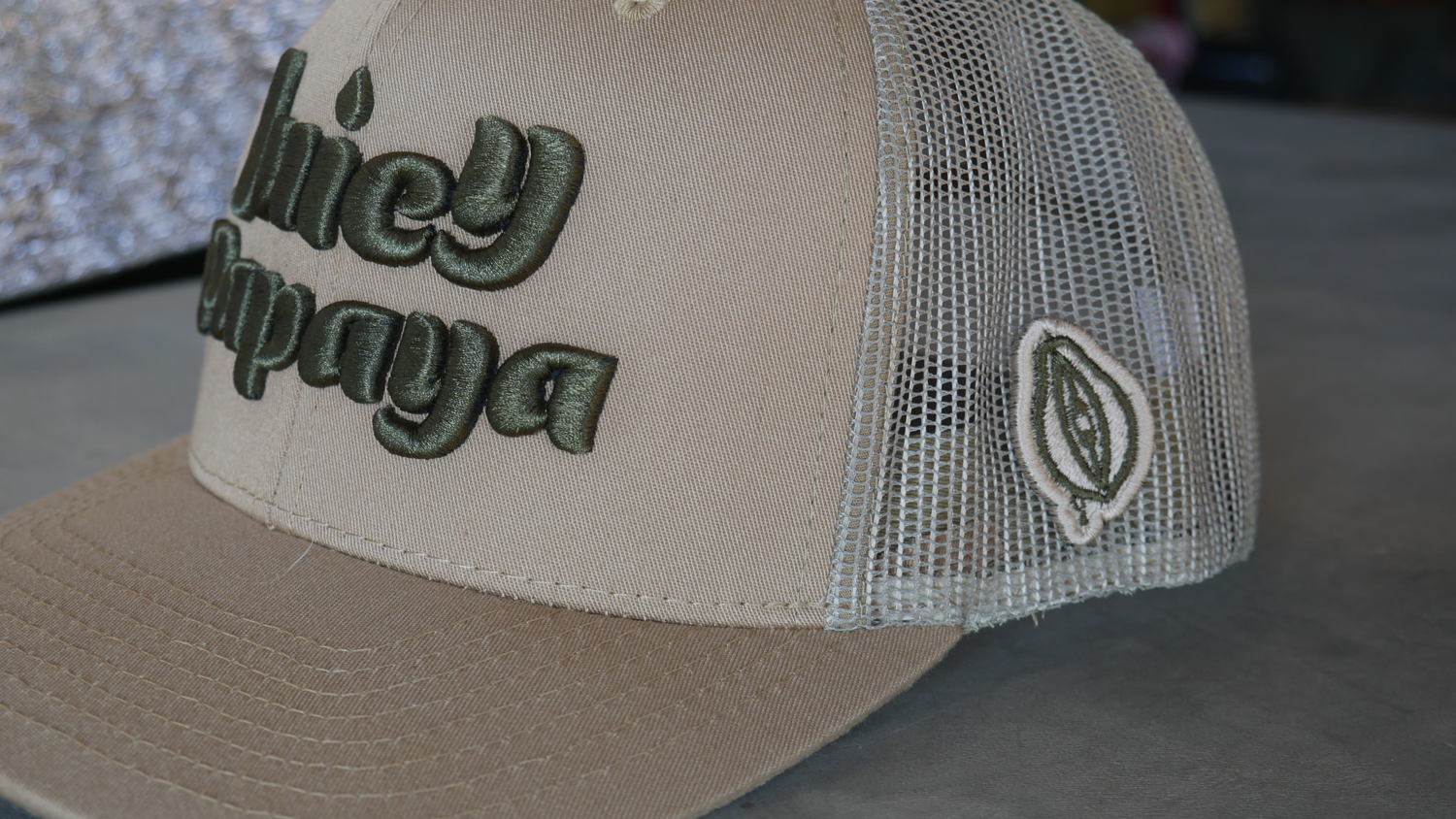 Gorra classic trucker beige, con bordado en 3D y cierre snapback de plástico.